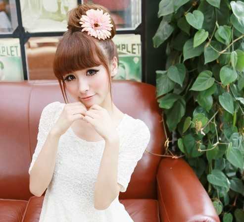 清爽的丸子头没有给人感觉有那么一点的累赘感,反而呈现的是最甜美最可爱的魅力,厚感发丝的齐刘海把女生迷人的小脸蛋显得十分俏皮,在丸子头中加入花朵发饰,还有点秋季田园的小风味。