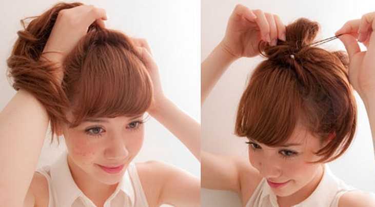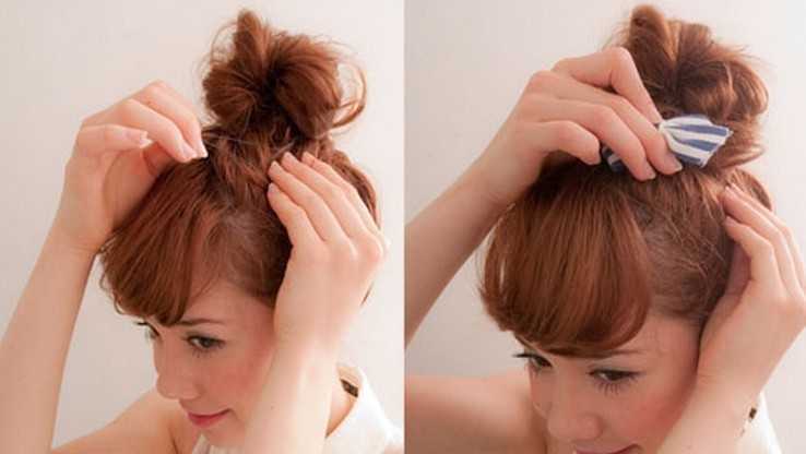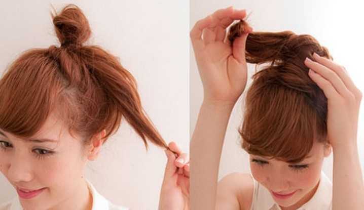 图解2、这时把发尾用手拉扯下来,再围绕着发髻处缠绕起来。
