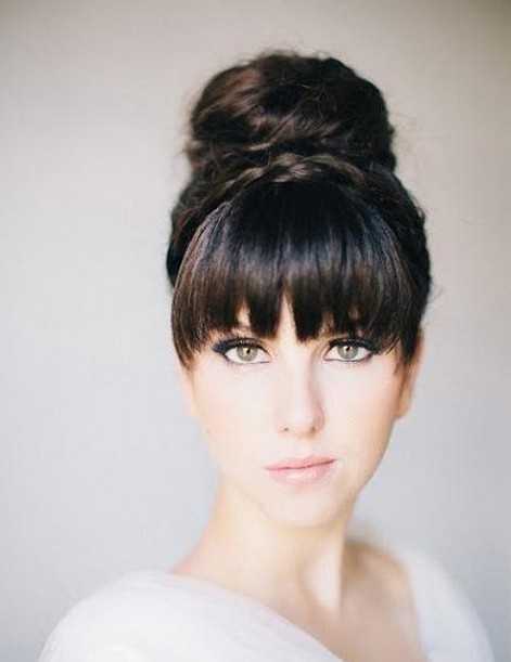 丸子头与编发的自然融合,更显华丽而优美,十分时尚欧美风丸子头发型,厚感的齐刘海遮盖额头的缺陷,巧妙打造出小脸美女效果。