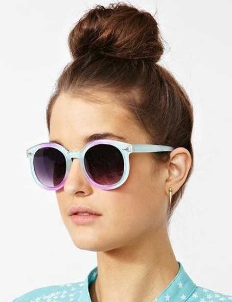 十分摩登的欧美范丸子头,在顶部处高盘的发髻,清爽露额的设计,干净而简洁,佩戴一副时尚墨迹,又是散发着个性的复古气息。