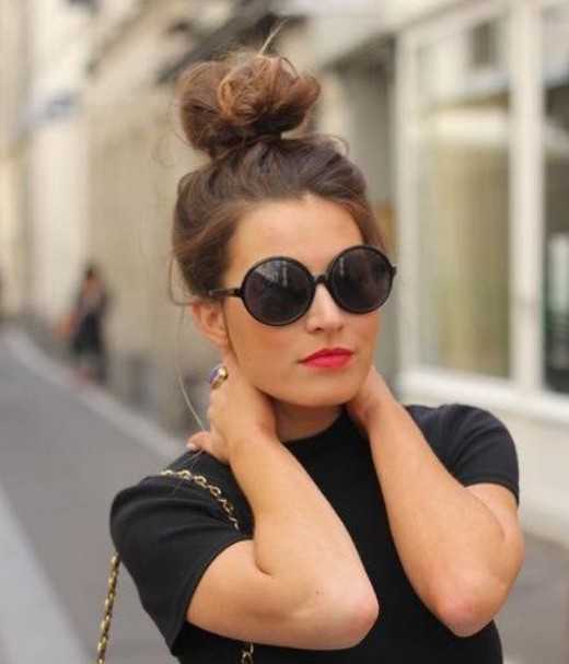 明星范十足的一款丸子头,结合经典红唇和复古墨迹的衬托,让欧美示范者看起来格外的性感自信,松散的发束扎起,还制造出一种凌乱自然美。