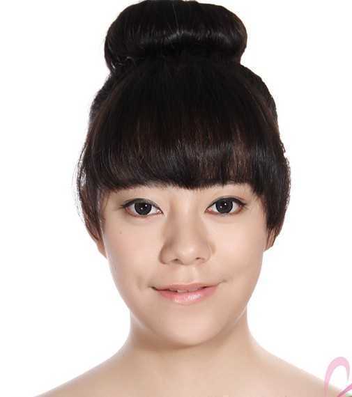 非常简约的高扎丸子头发型,整齐的发束来上个稍微厚感的齐刘海,正好是衬托大眼和清新的好法宝,冬季里甜美MM的首选哦!