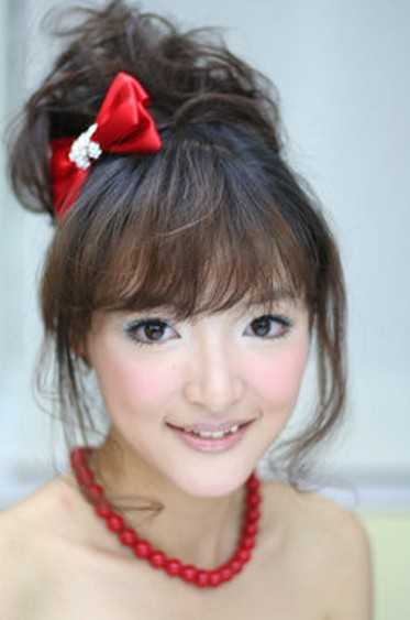 长卷发下,松散地扎起蓬松的丸子头发型,碎斜的刘海垂落几缕卷发丝,在冬季清新中隐约透出最气质温婉感觉。