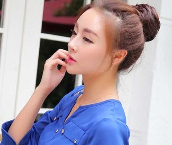非常漂亮而简单一款丸子头发型,无刘海设计所垂落的几缕发丝,彰显出女生很好的优雅温柔美丽,淡淡的棕色染发,倍增那时尚好看度!