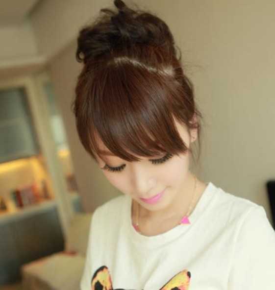 非常洋气的一款直发丸子头发型,少许凌乱美感的发丝,显露出如此甜美般的迷人感觉,斜分刘海搭配粉嫩妆容,韩系的气质别一番风味。