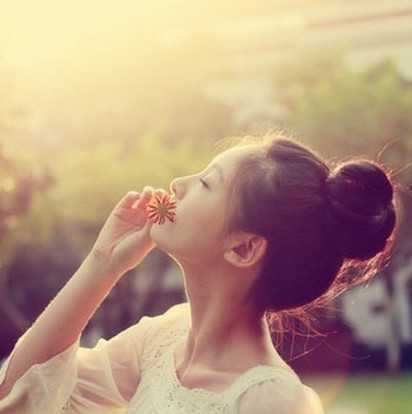 在黄昏夕下给自己拍照,场景如此唯美,清爽干净的丸子头,简单又不失时尚,闭上眼睛感受大自然一切,超美的一副景象。