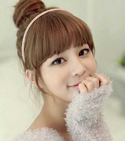 超具韩范的韩式丸子头发型,高高扎起的丸子头,在视觉上就是有显高的效果,前面剪齐的刘海,甜美可爱,少女们最爱的丸子头发型。