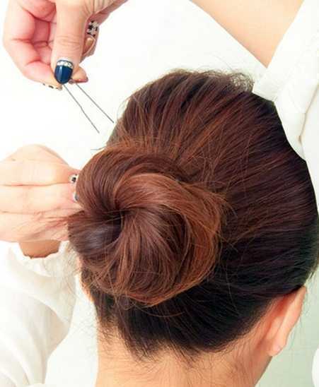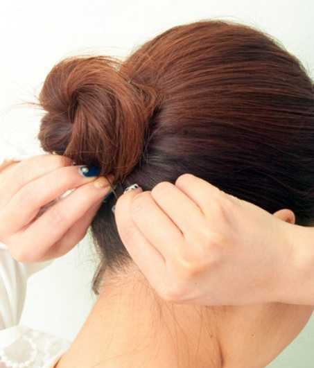 步骤六:扭转成丸子头后用黑色发夹固定。