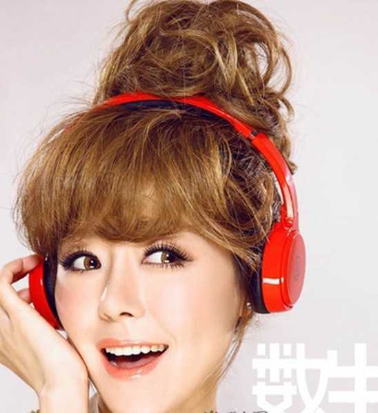 较为蓬松造型的一款丸子头扎发发型,卷曲的头发搭配厚感的卷发齐刘海,俏皮中又具甜美感觉,佩戴炫酷耳机后,洋溢着青春的动感气息。