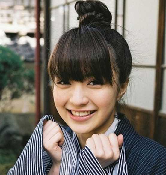 超甜美笑容的可爱女生,这样丸子头扎发发型就更显时尚有气质了,简单慵懒的发型,薄薄的齐刘海结合,显高效果非常明显,还很是俏皮感哦。