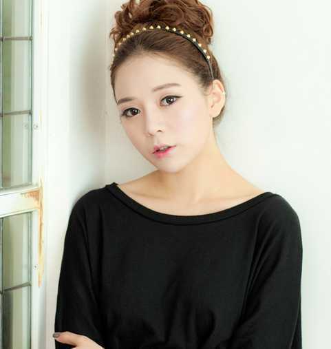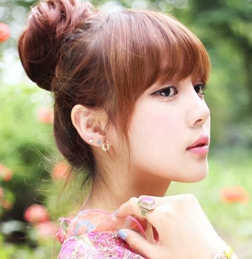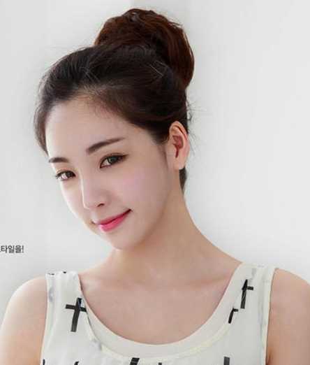 有着一张标志脸蛋的韩国妹子,无疑简单的丸子头假发盘发发型最显自然清纯美态了,内扣式的稀薄齐刘海结合后,给人一副美丽动人的侧面效果。