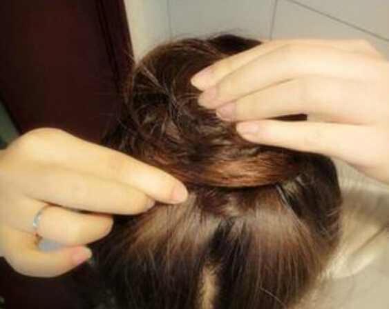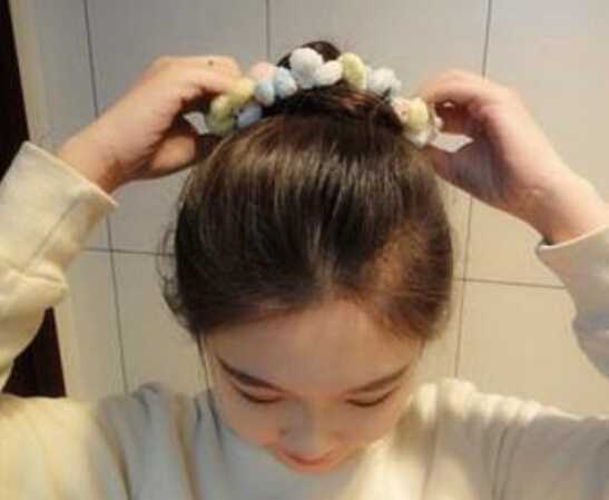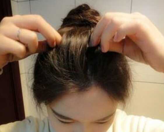 步骤九:固定好丸子头后就用手将头顶的头发弄蓬松点,这样看起来会更加好看自然。