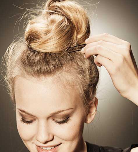 step7:把两束头发交叉扭转成饱满的丸子头,再用发夹固定好。