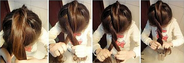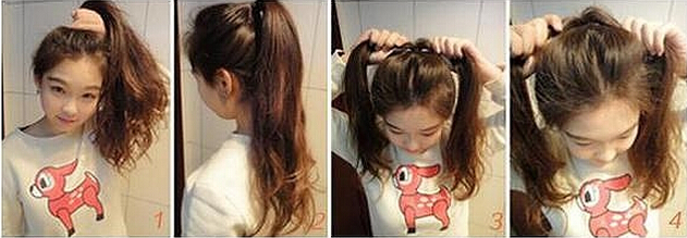 【韩式丸子头step03】针对发量少的女生该如何把丸子头扎得更加好看,可以把秀发分成两股,像扭麻花一样把这两股头发扭在一起,不要过于松散也不要太紧喔,掌握好力度即可。