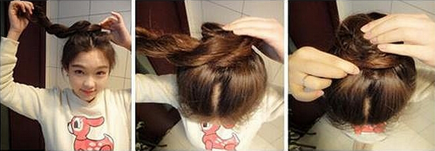 【韩式丸子头step02】为了发型太紧导致头顶造型的扁塌,可以把秀发分册分成两股,分别往左右两边拉开,头顶的秀发就自然会蓬松起来。