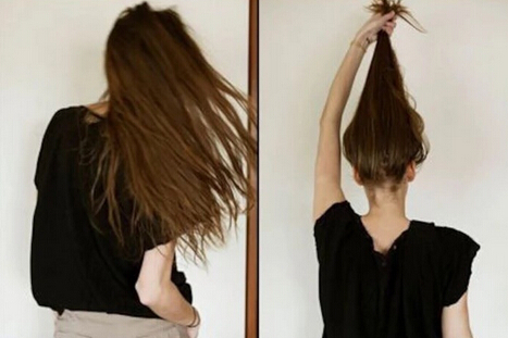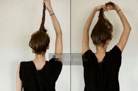 【丸子头教程step02】抓住全部秀发后,把头发顺时针地扭转,一直扭直发型顶部为止(如图)