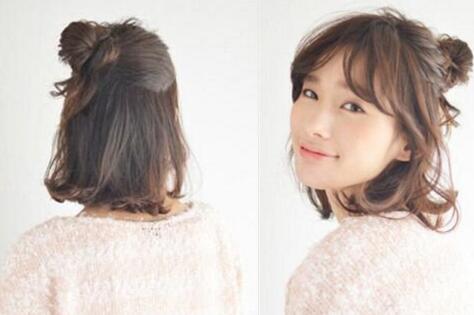 我们来看看完成后的效果图吧,很有造型感的说哦。齐肩的短发分成两份,一部分扎成一个可爱的丸子一部分垂放着,看起来简约率性,卷烫过的空气刘海随意斜挂在额头,修颜减龄,外翘的发尾凌乱之余又有俏皮感,面对如此甜美活泼的少女系半丸子头发型,妹子们喜欢吗?