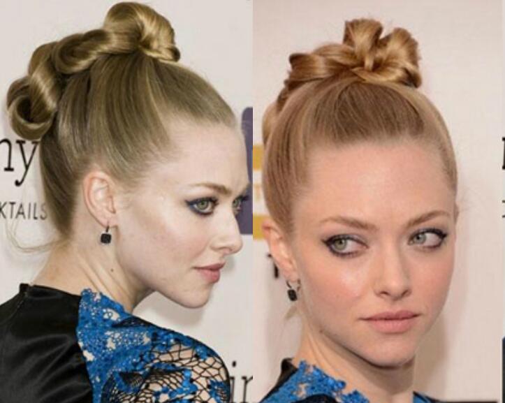 阿曼达·塞弗里德的这款丸子头发型看起来有些特别,在马尾的基础上把其编成三股麻花辫并使其缠绕在头顶上,最后用发夹在发尾处进行固定好就可以了。此款丸子头发型的特别之处在于丸子头是长形而不是常规的圆圆花苞状,因此更具潮流个性,而且搭配麻花辫,使整体造型显得复古又优雅,更彰显迷人的女人味。