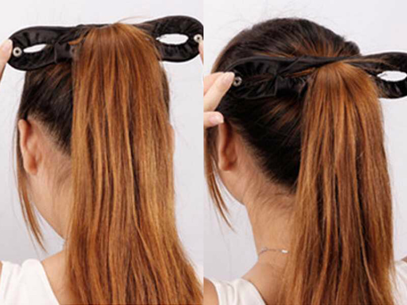 首先准备好要用到的工具,海绵盘发器、橡皮筋和发饰,将直发梳理好,用橡皮筋扎成一条高马尾,然后把马尾放到海绵盘发器中间,使盘发器穿过马尾并一直往里拉,到达马尾根部,就是橡皮筋的位置。