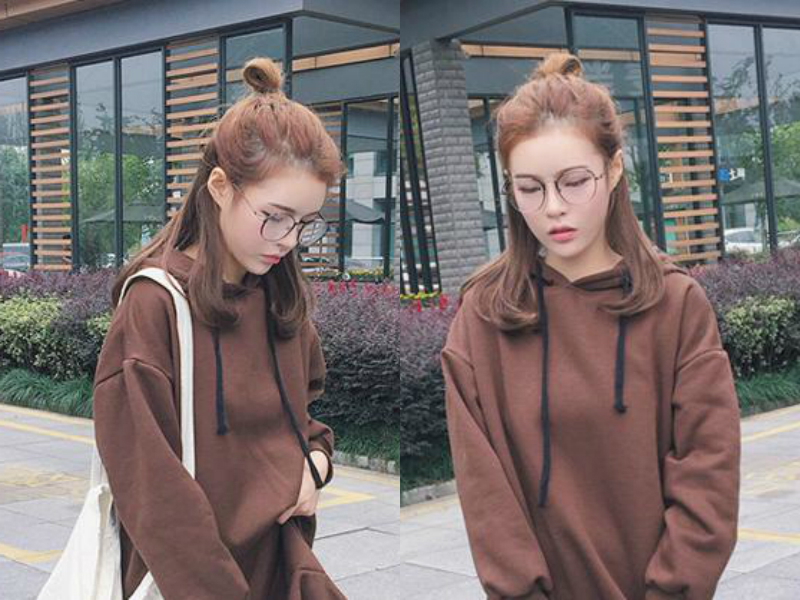 不知道是不是妹子自身气质的原因,小编觉得Half-Bun式半扎发发型在她身上显得很有学院feel。棕黄色的头发分成两部分,上部分被扎成一个整齐的小丸子,下部分则自然的披散着,显得有点漫不经心的感觉,所以如果你是想追求这种精心设计却看不出来造型感的Half-Bun式半扎发话,建议你可以稍微卷一下发尾,卷的时候注意要分区域,不要卷成一个大卷,像妹子这样把发尾稍稍打理出内扣卷的设计就很不错了。