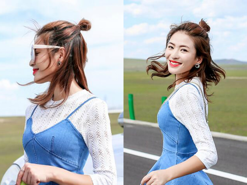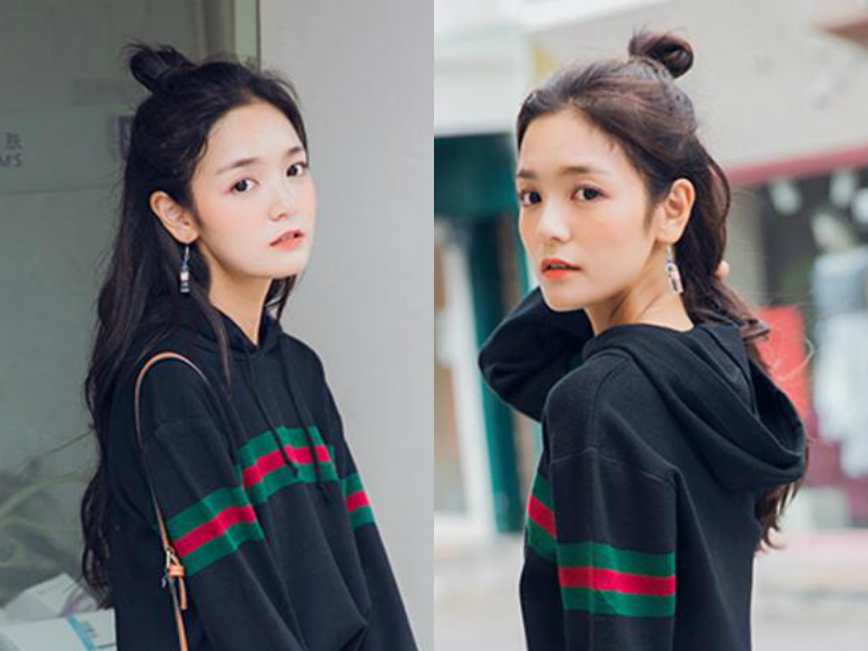 秋天风大,头发很容易被吹得乱七八糟,这时扎一个半丸子头就不必担心发型被吹乱了哦!额前头发全部梳于脑后并扎成丸子,由于没有发丝的遮挡女生光洁的脸蛋一览无遗,散落的头发随着妹子的跳动也飞扬起来,仿佛也在跳舞,那画面让人看了心情也不禁很愉悦