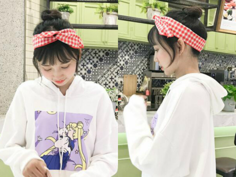 这款韩式清新全扎丸子头发型特别的地方在于戴上了一条格子发带,就瞬间变得充满田园气息。也许妹子头发不多,所以扎起来的丸子稍显小巧,薄薄一层的刘海柔顺的垂于脑门前,两侧还留下两缕稍长的刘海贴着两腮,更突出女生娇嫩的脸蛋。