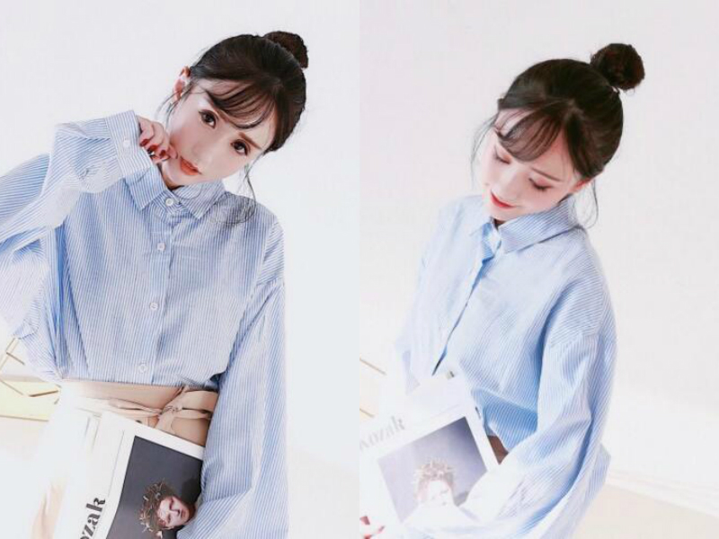 微微斜弯的空气刘海轻轻贴在额头前,看起来清爽透气,额头若隐若现之余突出了妹子一双灵动的大眼睛,后面的头发扎成一个丸子头,且梳理得一丝不苟,搭配天蓝色衬衫,增添学院气息的同时也展现出妹子的清纯气质。