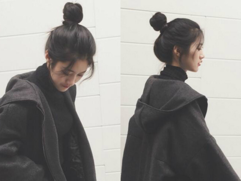 这是比较蓬松的一款丸子头扎发发型,头发被捋到一起扎成一束高马尾,再缠绕成一个丸子垂在脑后,贴着头部的发丝被打理出蓬松感,侧面看过去可以看见发型饱满的弧度线条,额头前几缕轻柔的发丝随意散落,使妹子在冷冷的冬天里变得更加柔美动人。