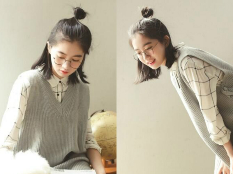 妹子的一头秀发乌黑有光泽,在冷清的冬日里本就吸睛,再扎一个流行的半丸子头发型,可不要太漂亮了!有点毛茸茸的刘海修剪到眉毛上,看起来有点呆萌感,后面披散着的头发隐约可见一些曲线弧度,这就使妹子增添了一丝甜美气息,头上则竖立着一个紧实的丸子,整个造型越看越觉得充满青春活力感,真的特别适合死气沉沉的冬天。