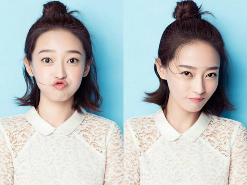 齐肩的短发,凌乱翘卷的发尾,修饰出完美的颈部线条,中分的刘海露出光洁的额头,少量的头发别到耳朵后面,妹子圆圆的小脸蛋显得更加清纯动人,扎上一个丸子头,更是娇俏可爱。