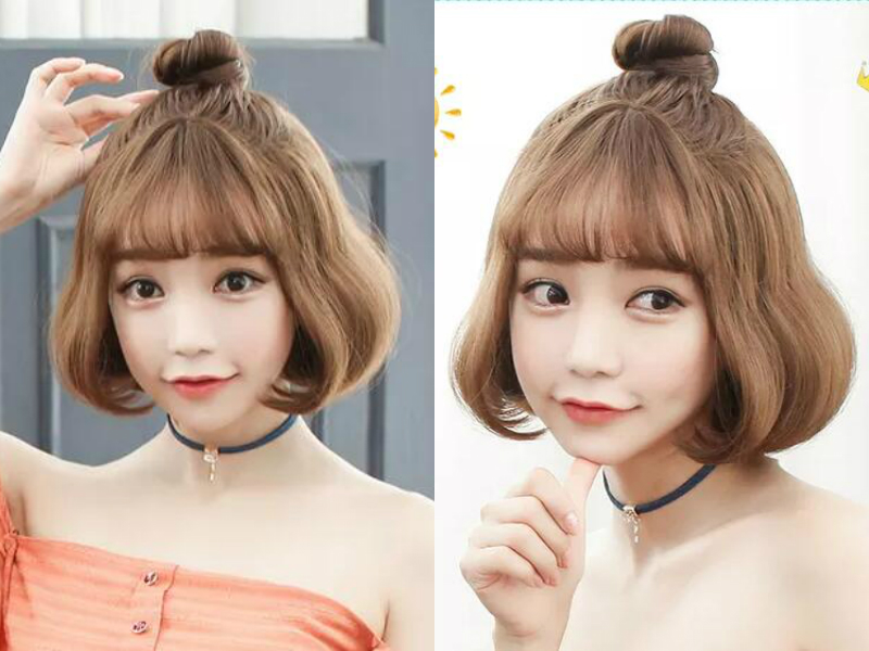 梨花头的短发发型,发尾再加上点内扣,卷卷弧度加点蓬松感,轻薄的空气刘海遮住额头,很好的把圆脸修饰成精致的小脸,头上扎上一个小巧的丸子头,让妹子变得清新又可爱。