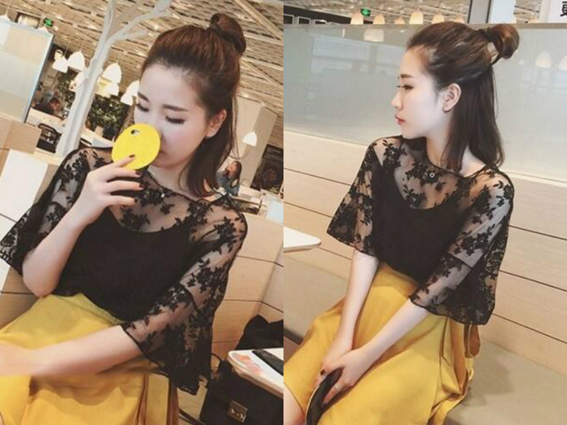 女生随意自然的齐肩韩式短发,看起来清纯有气质,高高扎起的半丸子头简约又有个性,无刘海露出光洁的额头和精致的五官,身穿黑色薄纱上衣和黄色裙子,彰显优雅的气质。