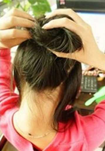 将扎好的马尾向上中心卷起弄成一个简单的丸子,再用夹子将卷好的丸子固定好。