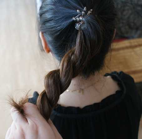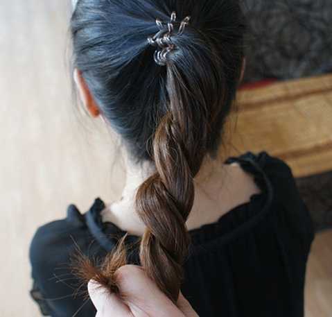 把刚才分好的两部分头发相互缠绕,注意在这个过程中不要放手哦,那样会变得松散,变得凌乱哦,一直缠绕到发尾。