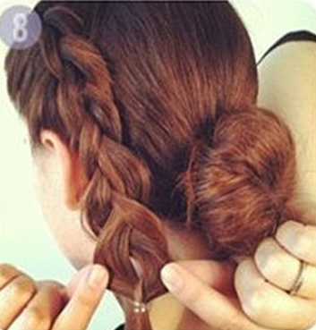 编好麻花辫后可以适当地将麻花辫拉松一点,左右都是哦,这样出来的效果会好一点哦,然后再在左侧麻花的末端拉开一个小孔,将右侧的麻花辫塞进去然后再从另一侧拉出来,交叉在花苞上面。