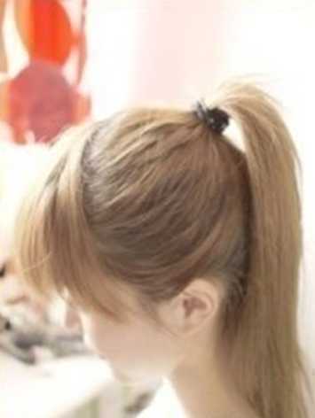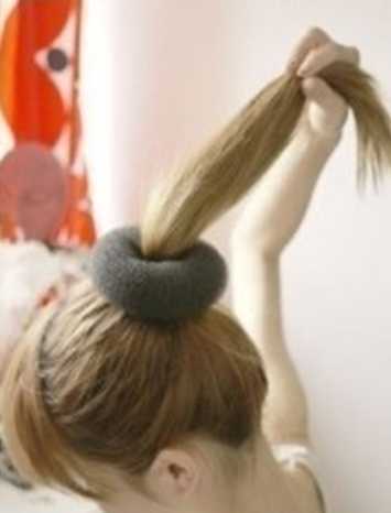 把头发梳好后再扎一条高马尾,然后再用盘发甜甜圈,刘海留着可以增添甜美感哦,稍微有点长刘海的也可以留着哦,再把头发往上拿起。