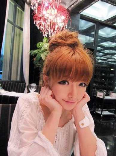 碎齐的刘海,蓬松稍带凌乱感的丸子,亚麻黄的头发,