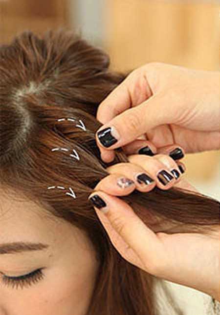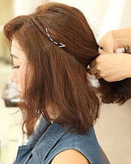 简单地对头发进行梳理后就可以开始扎发了,首先如图所示将头顶的一部分头发往后固定好,然后前面一部分头发(也即是刘海)不要扎。