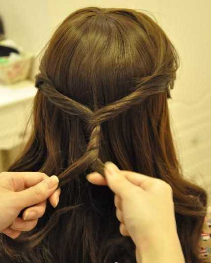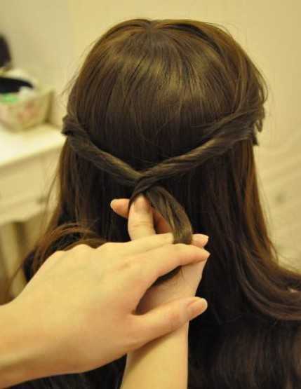步骤四:左侧旋转好后可以先用一个小夹子固定好,然后再在右侧用同样的方法旋转编成一条小辫子,编好后再将两条小辫如图交叉在一起。