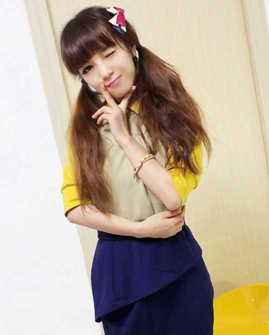 碎刘海,两条蓬松的马尾,超级萌又超甜美,粟米烫感觉的长发,增添了几分时尚感,甜美feel的发饰尽显清新可爱气息,透着几丝俏皮感。