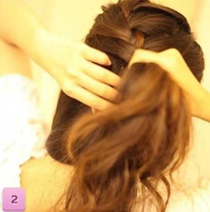 步骤二:将下半部分头发放下,然后再将上半部分头发分成三份,从头顶左侧往右侧编马尾。