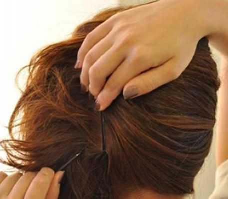 步骤五:接下来亲们可要看清楚后面的头发是怎么盘咯,将剩下的头发全部以同样的方式侧重往右边扎,用夹子固定,记住要扎高点。