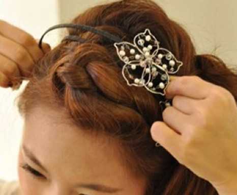 步骤六:扎好之后,记住将全部的头发侧重在右边遮住耳朵,添加上发饰,这款头发就大功告成咯!