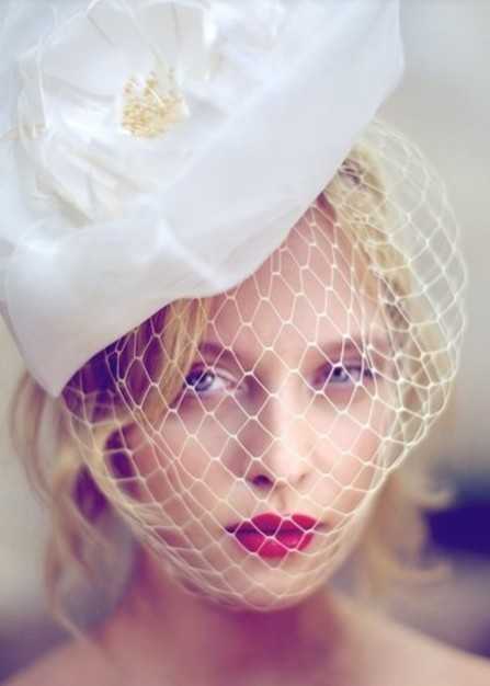 中分的发型设计,马尾随意扎起,最特别的地方在于头纱,一朵飘逸的白色花朵,栩栩如生,白色的网格遮住脸部,若隐若现的,使新娘更加神秘魅力。