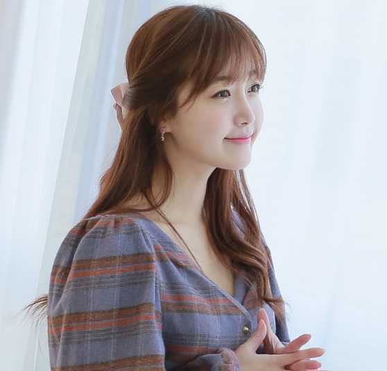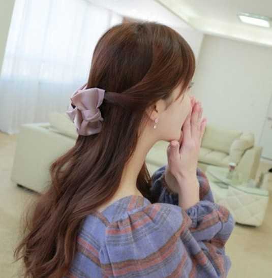 长发用上蝴蝶结发饰半扎于脑后,发尾的微卷,又带股小优雅气质,很甜美气质感。