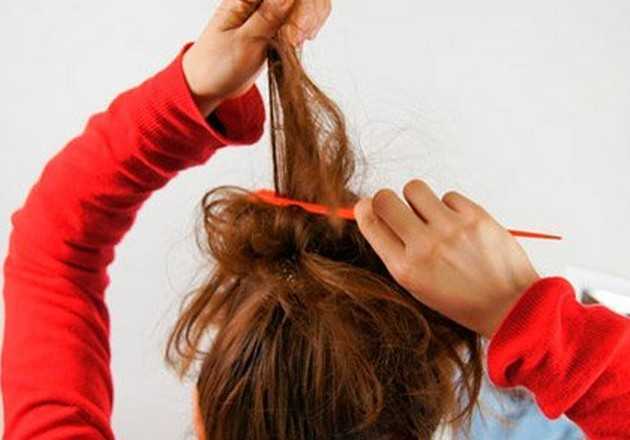 5、这时使用尖头梳用手倒梳头发,使其制造出蓬松的感觉。