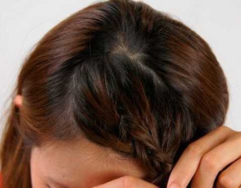 1、把全部头发梳理整齐后,取出长刘海部分,编织四股麻花辫的方法,在编织时需加入新的发束哦!直到把头发编完为止。