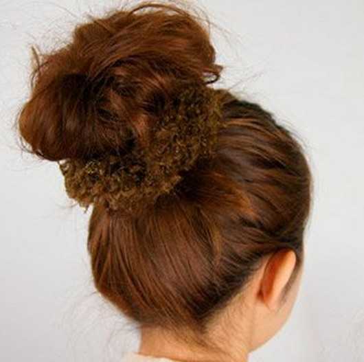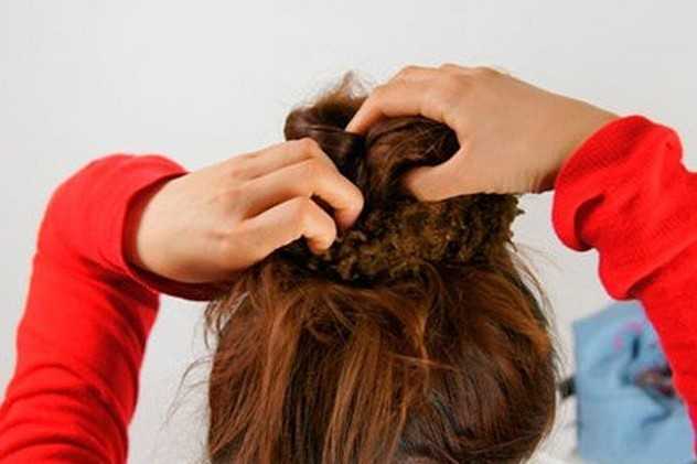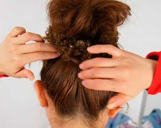 7、再将马尾缠绕成花苞形状后,使用橡皮筋固定好。