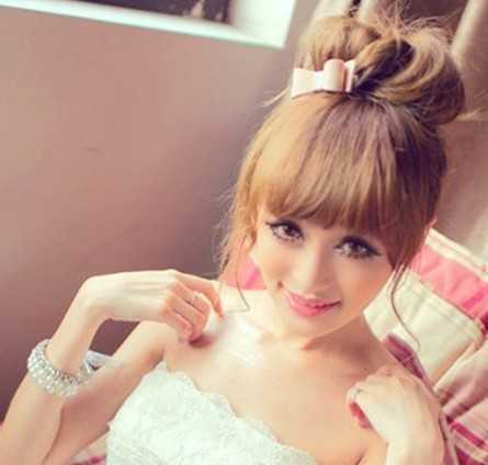 超级甜美的丸子头扎发,蓬松又大的丸子头盘在头顶上,一个简单精致的发夹轻松就展现出甜美气息,两颊留出来的发丝很好修饰了妹子的脸蛋。