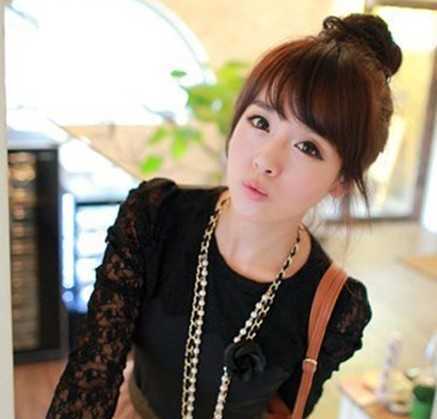 简约、时尚的一款丸子头扎发,斜开的刘海,展现出甜美感,高高扎起来的丸子头,看似很简单却不失美感。